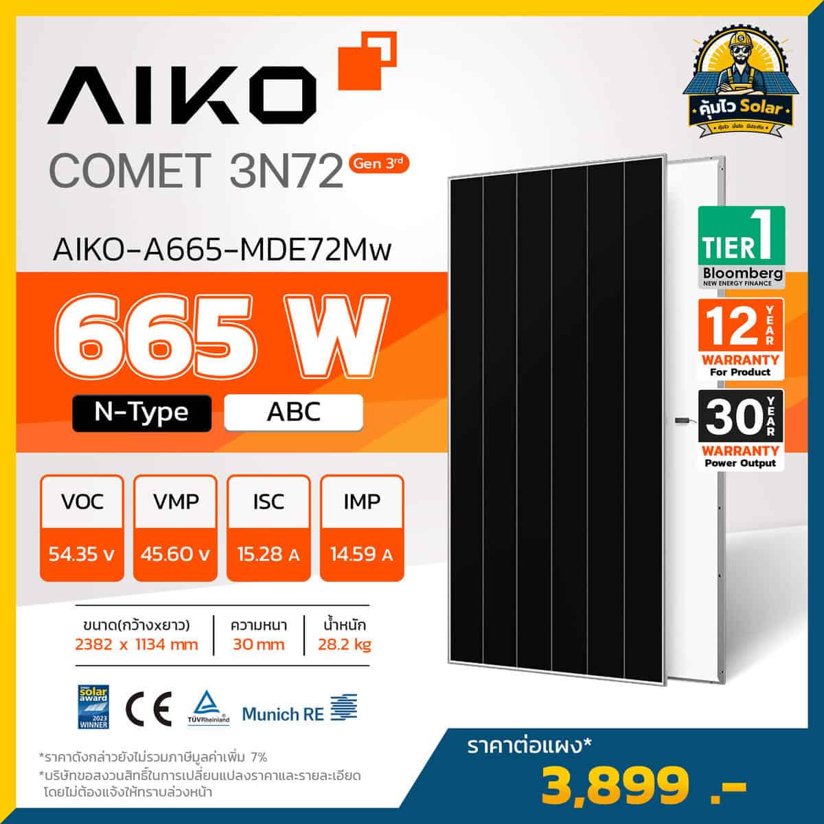 ยกระดับระบบโซลาร์เซลล์ของคุณด้วยนวัตกรรมล่าสุดจาก AIKO Solar ผู้นำด้านเทคโนโลยีเซลล์แสงอาทิตย์แบบ ABC (All Back Contact) ระดับโลก (Tier 1 Bloomberg) กับซีรีส์ Comet 3N72 (Gen 3rd) ซึ่งถูกออกแบบมาเพื่อมอบประสิทธิภาพการผลิตไฟฟ้าที่เหนือกว่า ด้วยเทคโนโลยีเซลล์แบบไร้บัสบาร์ด้านหน้า ลดการบังแสง เพิ่มพื้นที่รับแสงสูงสุด