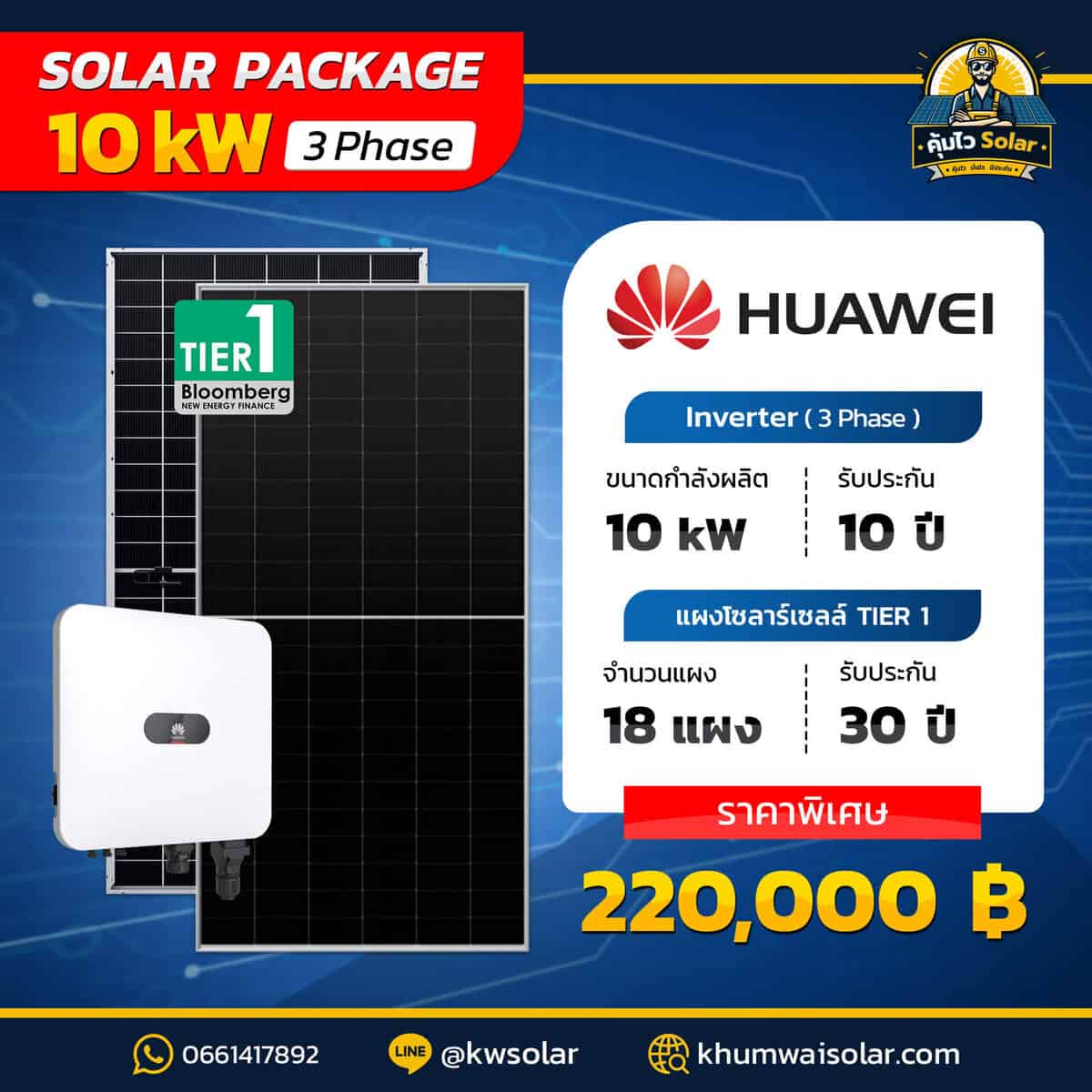 ชุดโซล่าเซลล์พร้อมติดตั้ง 10kW Inverter Huawei ระบบไฟ 3 เฟส – ประหยัดพลังงานอย่างมีประสิทธิภาพ