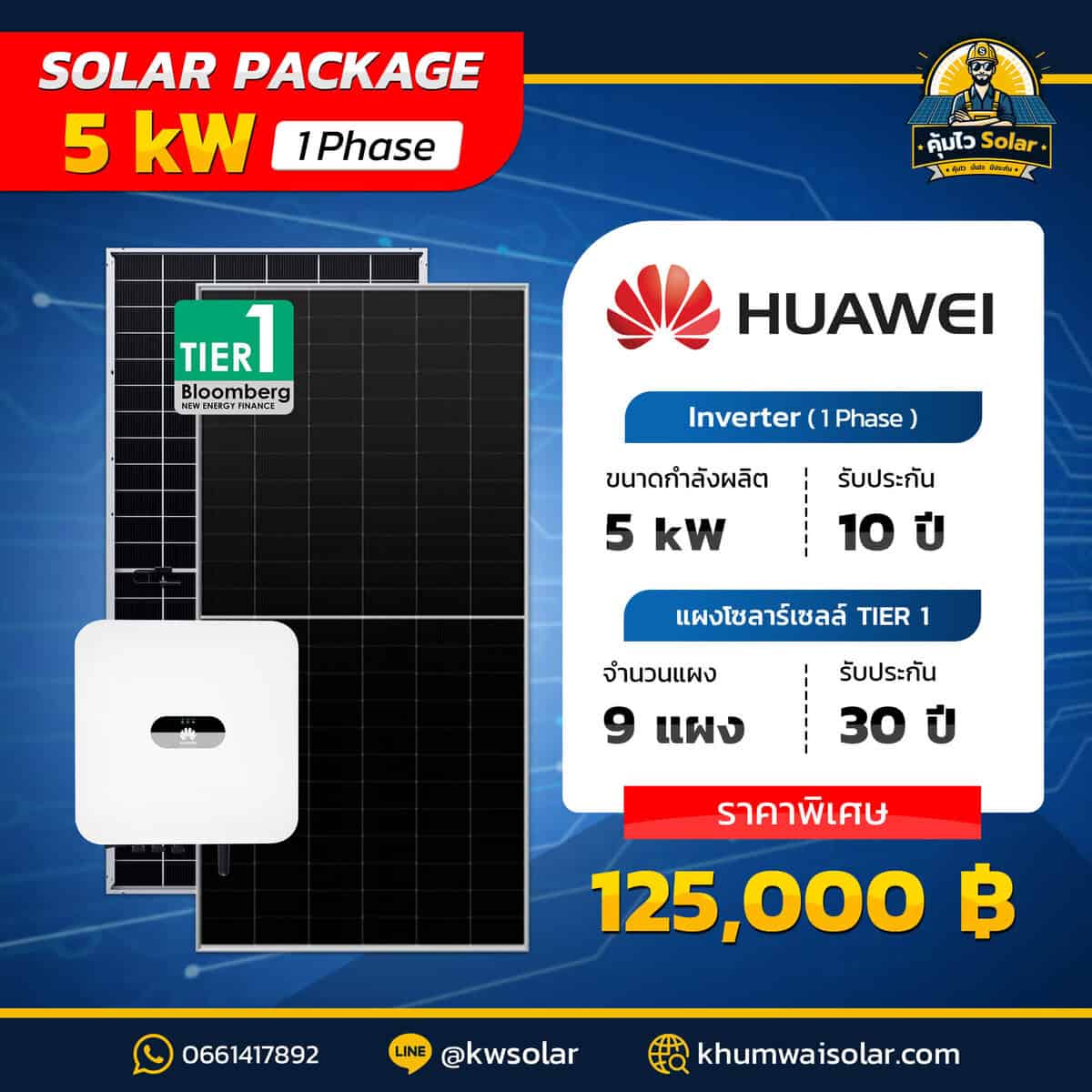 Inverter: Huawei SUN2000-5KTL-L1 (รองรับ 1 เฟส), รับประกัน 10 ปี