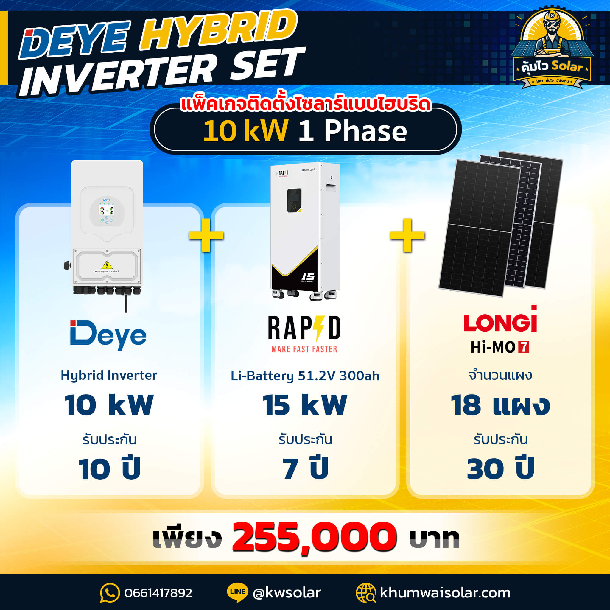 ชุดโซล่าเซลล์ Hybrid 10000W | Inverter DEYE | ระบบไฟ 1 เฟส พร้อมแบตเตอรี่ RAPD