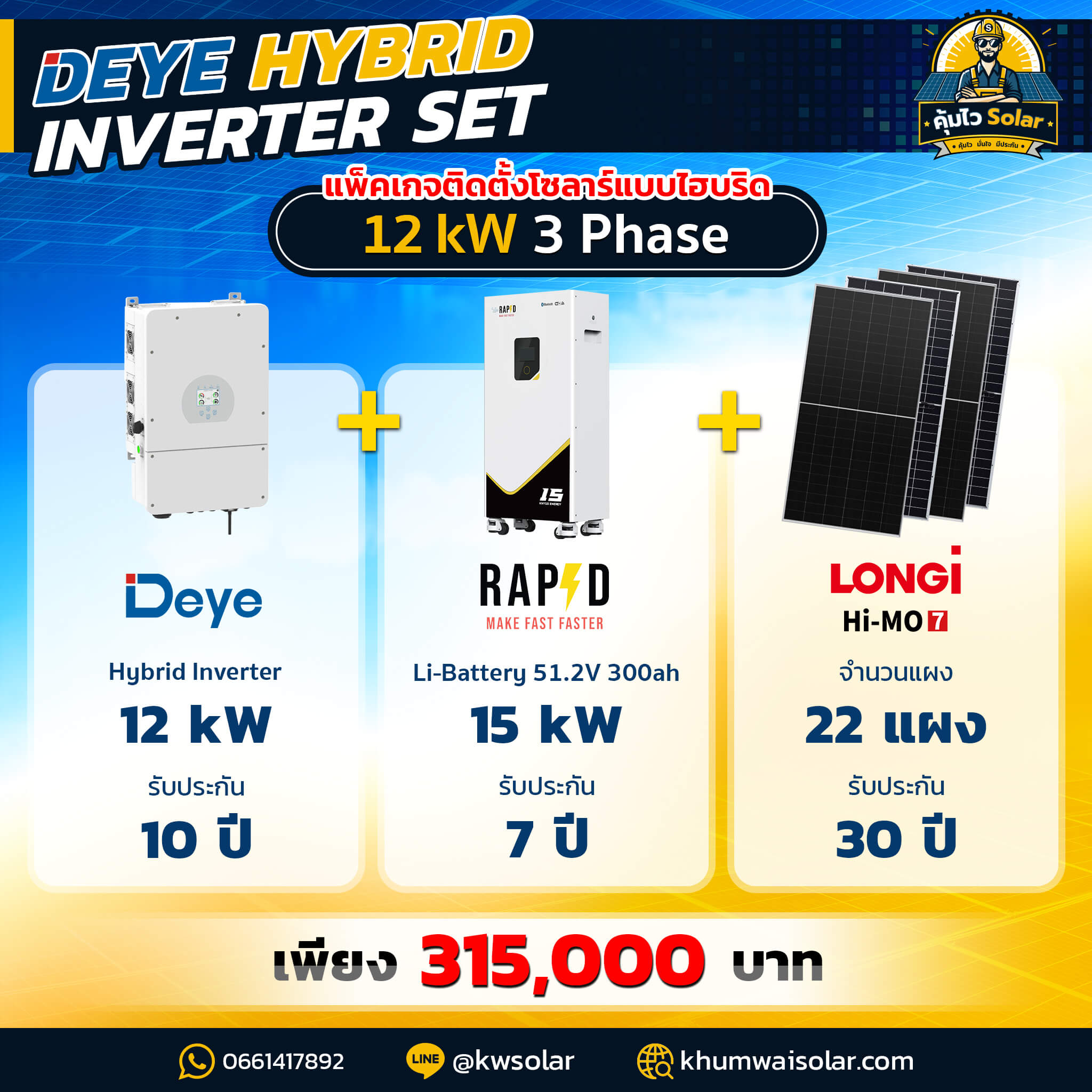 ชุดโซล่าเซลล์ Hybrid 12kW ระบบ 3 เฟส เหมาะสำหรับบ้านพักอาศัยขนาดใหญ่ โรงงานขนาดเล็ก และธุรกิจที่ใช้ไฟฟ้า 3 เฟส ใช้งานได้เต็มประสิทธิภาพทั้งกลางวันและกลางคืน มาพร้อมอินเวอร์เตอร์ Deye Hybrid ขนาด 12kW รับประกัน 10 ปี แบตเตอรี่ลิเธียม RAPD 51.2V 300Ah (15kW) รับประกัน 5 ปี และแผงโซลาร์เซลล์ LONGi Hi-MO 7 กำลังผลิต 545W จำนวน 22 แผง รวมกำลังผลิต 12 kWp รับประกันยาวนานถึง 30 ปี