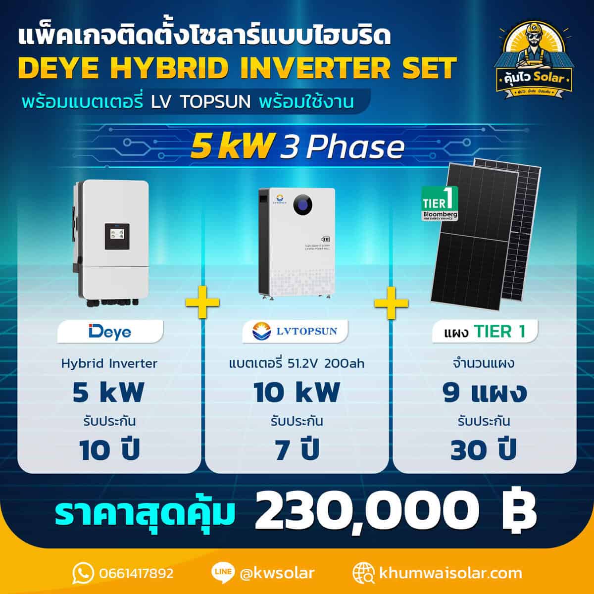 เหมาะสำหรับบ้านหรืออาคารที่ใช้ไฟฟ้าแบบ 3 เฟส และต้องการระบบโซล่าเซลล์แบบ Hybrid ที่สามารถสำรองไฟฟ้าไว้ใช้ในช่วงกลางคืน แพ็กเกจนี้มาพร้อมอินเวอร์เตอร์ Deye ขนาด 5kW, แบตเตอรี่ LVTOPSUN 10kW และแผง Tier1 (JA/Trina/LONGi/Jinko) จำนวน 9 แผง กำลังผลิตรวมประมาณ 5kW