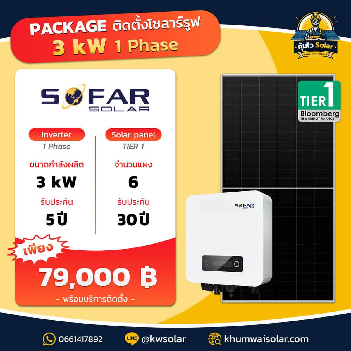 Inverter: Sofar Solar 3.3kW (1 เฟส), รับประกัน 5 ปี