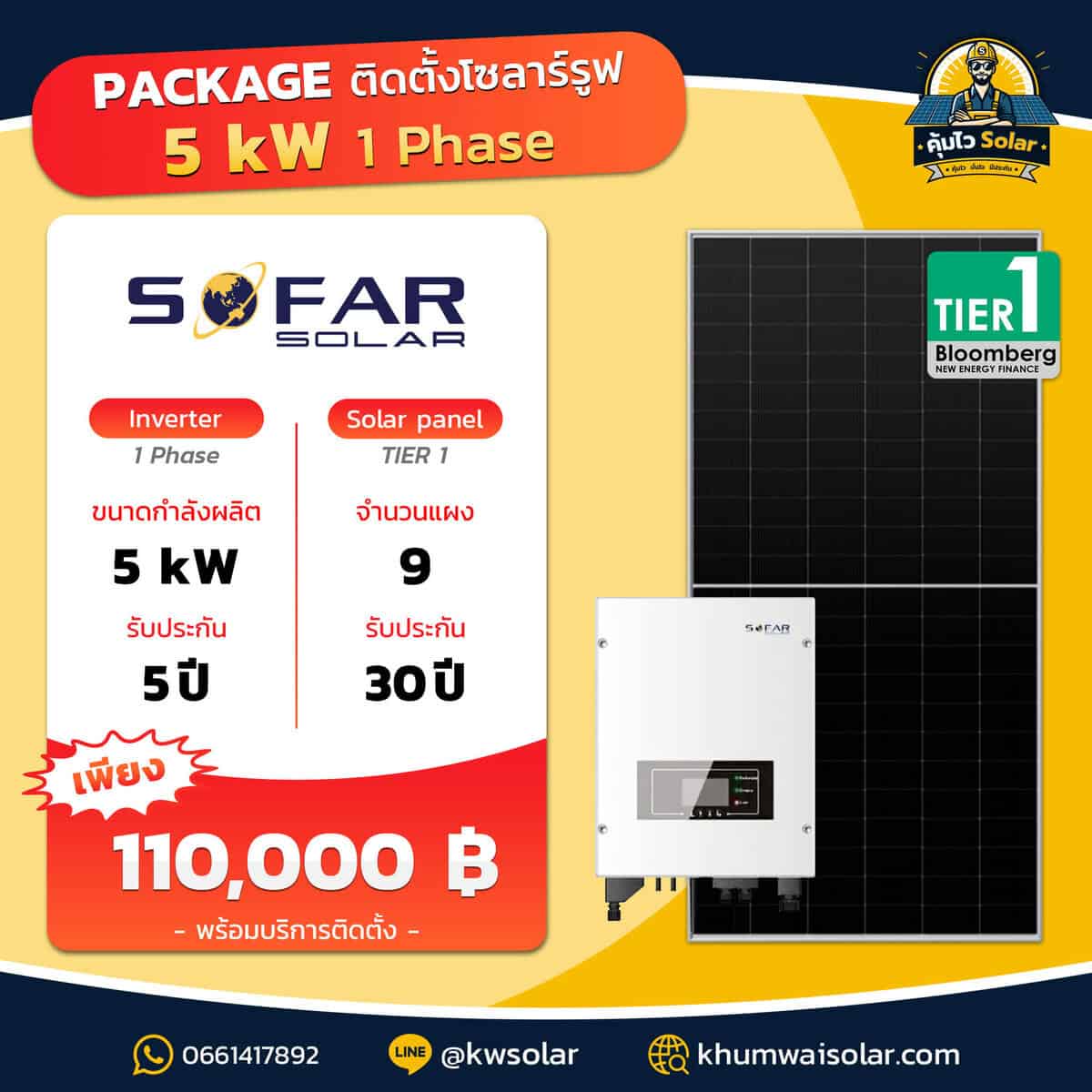 ชุดโซล่าเซลล์ 5kW | Inverter Sofar | ระบบไฟ 1 เฟส