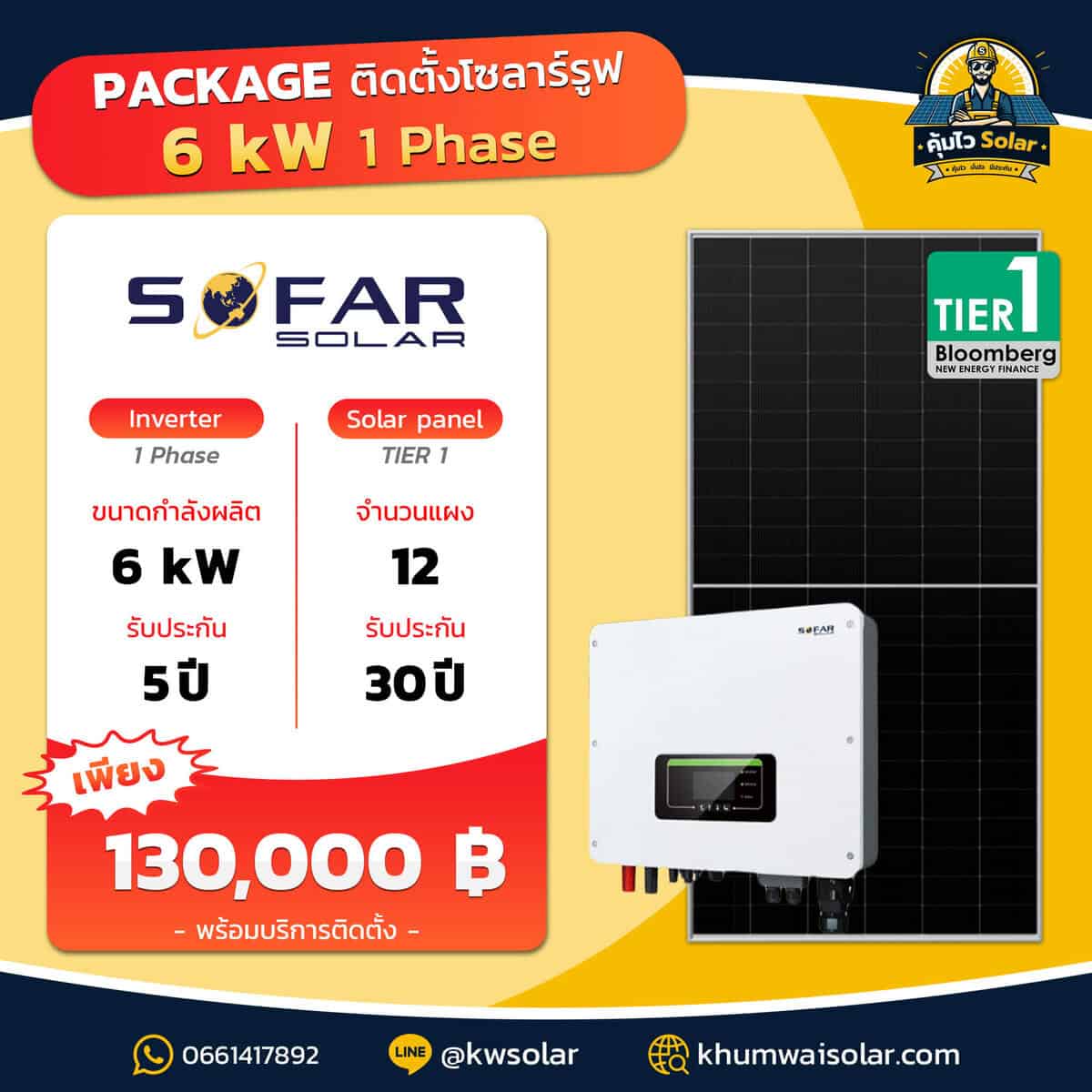 Inverter: Sofar Solar 6kW (1 เฟส), รับประกัน 5 ปี