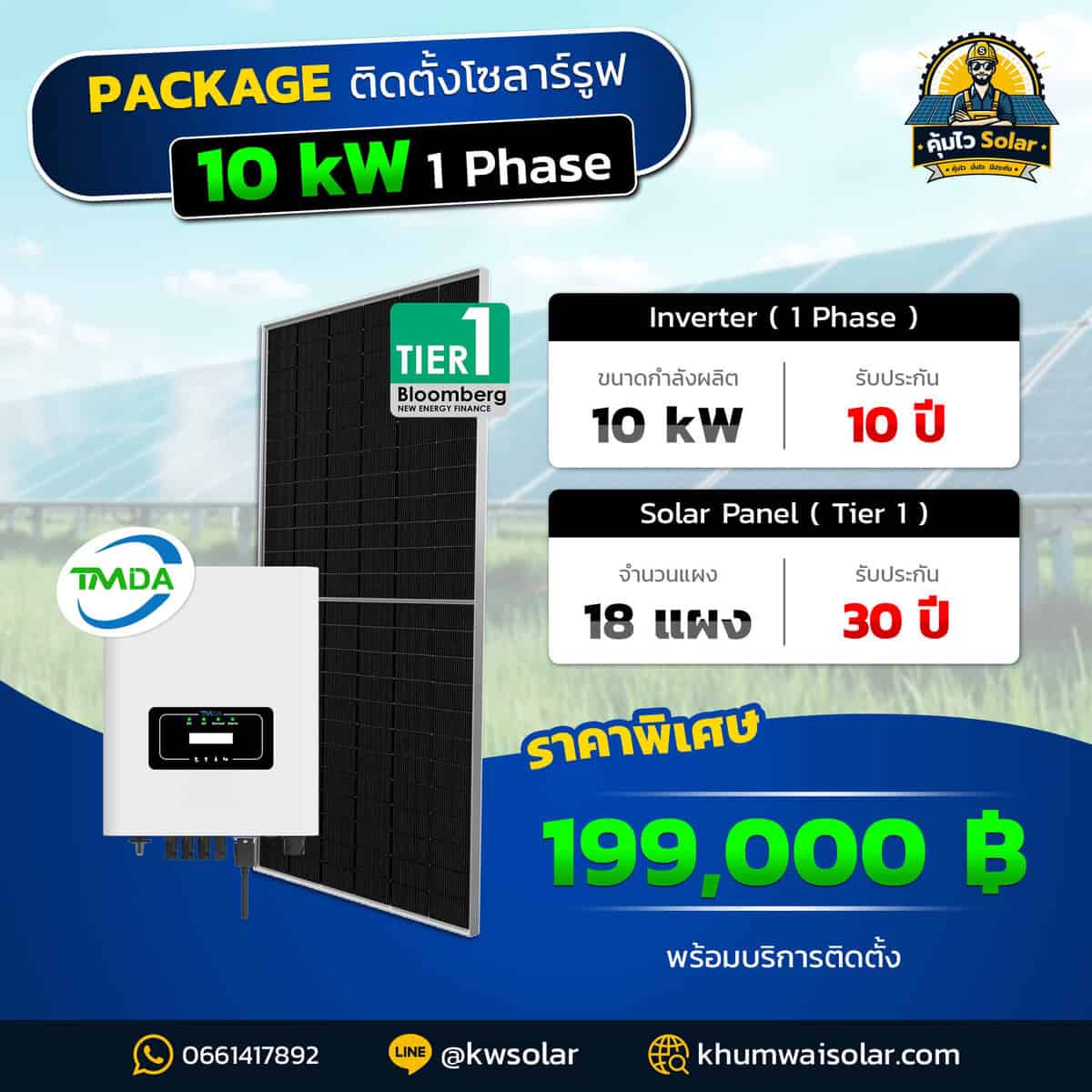 Inverter: TMDA 10kW (1 เฟส), รับประกัน 10 ปี