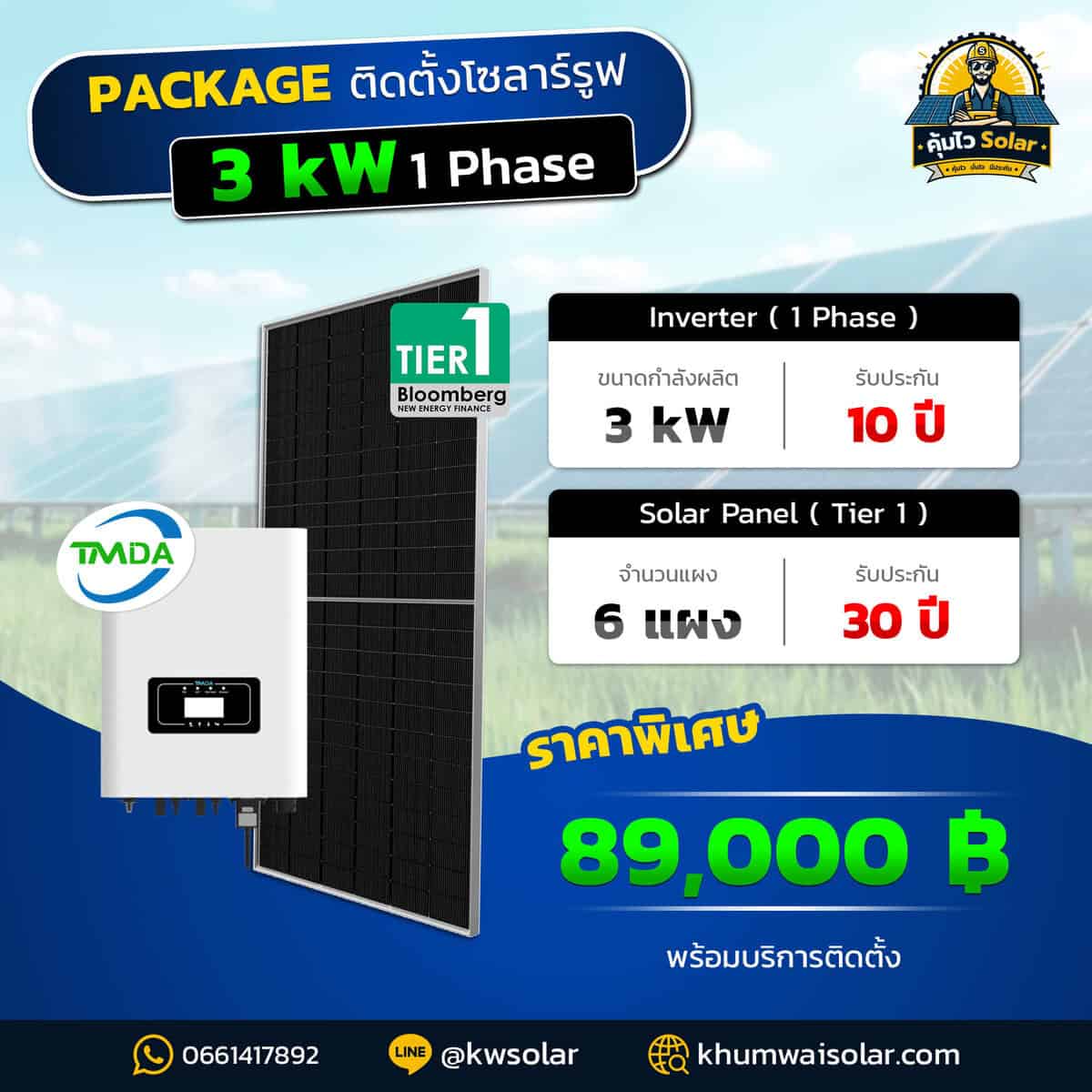 Inverter: TMDA 3kW (1 เฟส), รับประกัน 10 ปี