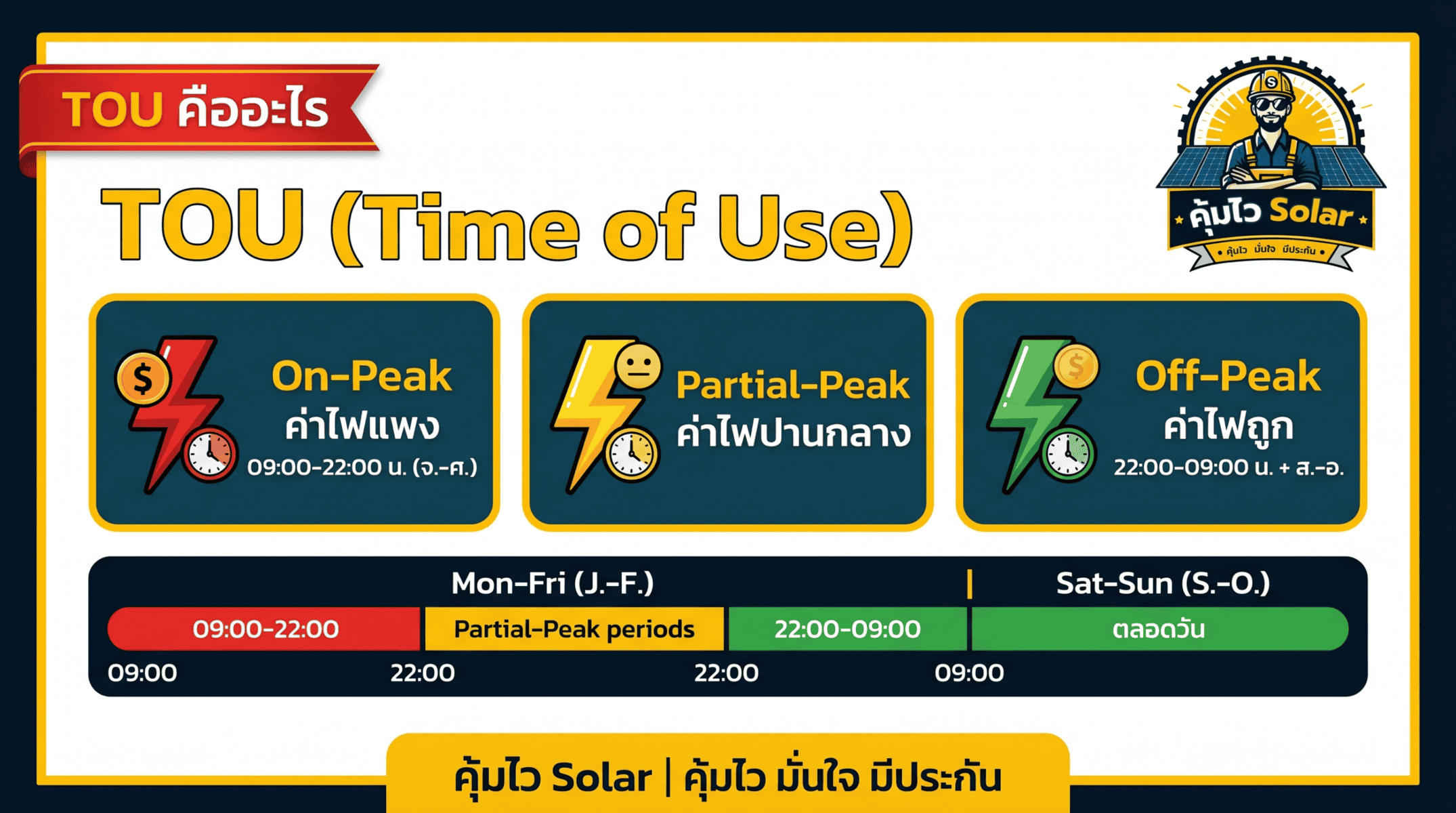 | ช่วงเวลา On-Peak | 09.00 – 22.00 น. (จ.-ศ.) | 18.30 – 21.30 น. (ทุกวัน) |