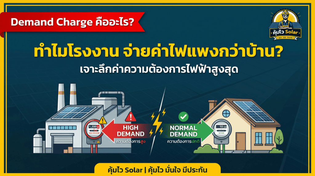 ในบทความนี้ คุ้มไว Solar จะพาคุณไปทำความเข้าใจอย่างละเอียดว่า Demand Charge คืออะไร ทำไมการไฟฟ้าถึงต้องเรียกเก็บค่าธรรมเนียมนี้ และที่สำคัญที่สุดคือ เราจะนำเสนอวิธีลดค่า Demand ไฟฟ้าที่มีประสิทธิภาพ เพื่อช่วยให้ธุรกิจของคุณประหยัดต้นทุนและเพิ่มผลกำไรได้อย่างยั่งยืน